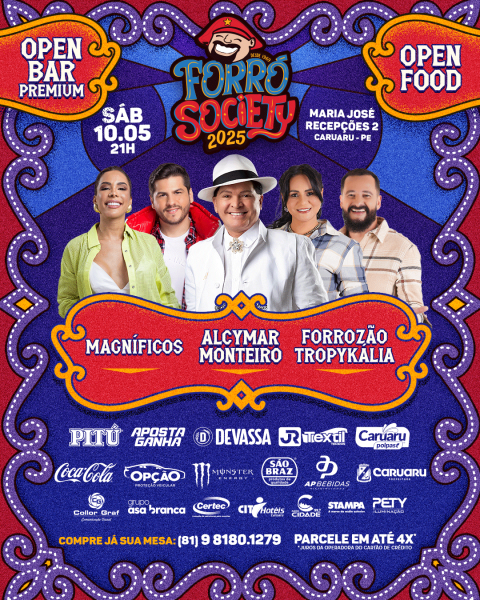 Mantendo a tradição, o Forró Society (@forrosociety) se antecipa e abre mais uma vez os festejos juninos em Caruaru. No dia 10 de maio a sociedade caruaruense e convidados vindos de todo o Nordeste já marcaram na agenda o evento que é o mais esperado do ano. Em 2025, o Society tem atrações para ninguém ficar parado, um trio de peso digno de noite especial no Pátio do Forró: Alcymar Monteiro, banda Magníficos e Forrozão Tropykália. O evento é no padrão premium com open bar e open food durante toda a noite.