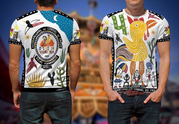 A camisa oficial do próximo desfile do Galo da Madrugada é assinada pela figura maior da Xilogravura pernambucana, com trabalho reconhecido internacionalmente. Para o projeto, o Mestre Artesão J. Borges, natural de Bezerros, uniu em uma mesma ilustração elementos da natureza, como pássaros, mandacarus e o próprio céu estrelado do Sertão, e os foliões que desfilam no carnaval. O destaque da camisa é o altivo e colorido Galo da Madrugada reinando absoluto na folia. A arte é fruto do entalhe na madeira que caracteriza o trabalho de J. Borges e vem reforçar a identidade visual do desfile. As camisas, que vão dos tamanhos infantis – a partir de 4 anos – até o tamanho adulto – XG, serão vendidas a partir da próxima semana, na sede do Galo da Madrugada e nas lojas Narciso Enxovais, a R$ 30,00.