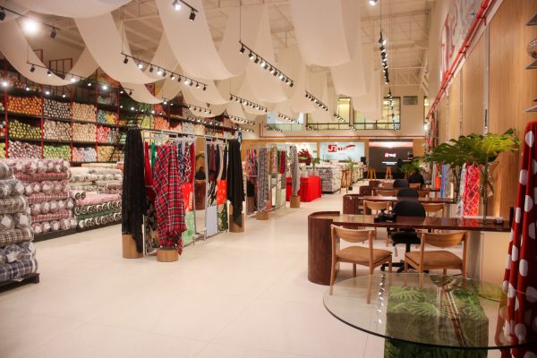 O novo espaço impressiona logo na entrada. A arquiteta Mariana Vidigal concebeu um ambiente que equilibra funcionalidade e estética contemporânea, pensado para receber tanto o atacadista experiente que sabe exatamente o que procura quanto o profissional que quer explorar novidades e se inspirar. As prateleiras organizadas, a iluminação cuidadosa e a disposição dos tecidos transformam a experiência de compra em algo muito próximo de um showroom de moda.