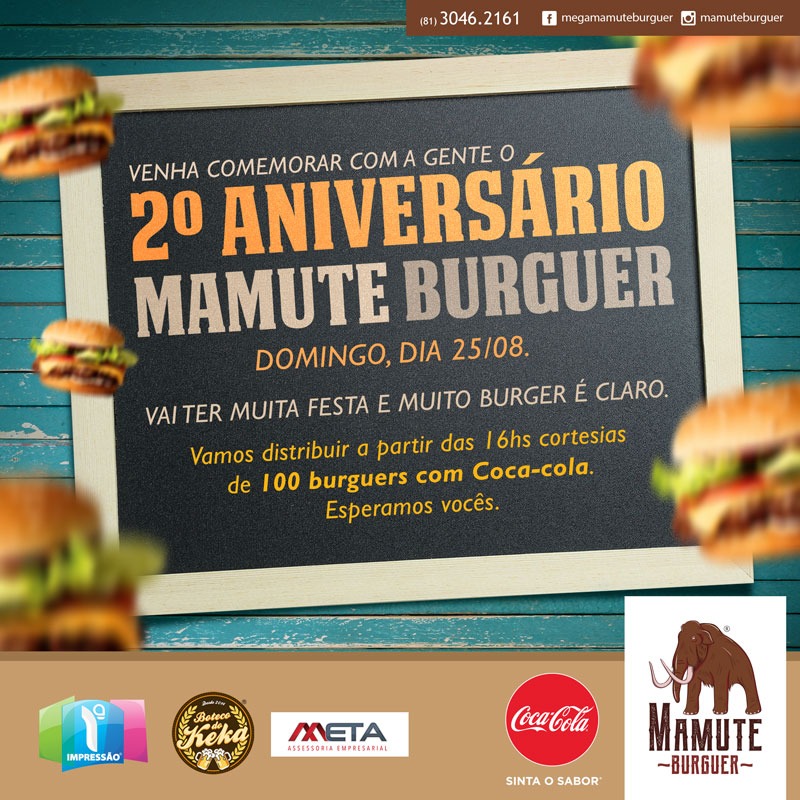No próximo domingo, 25 de agosto, a partir das 16h, o Mamute Burguer comemora o segundo aniversário. Para marcar a data, uma super promoção promete dar o que falar. As primeiras 100 pessoas que comparecerem ao local vão ganhar hamburguês e Coca-cola de graça.