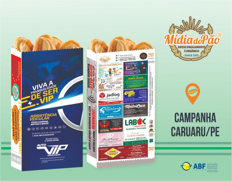 Por meio da venda de anúncios fracionados ou únicos nas embalagens disponíveis pela franquia, a Mídia do Pão Caruaru, já lança sua primeira tiragem de saco de pão na próxima quinzena. As sacolas estarão disponíveis, de forma gratuita, nas melhores padarias. Com esta ação em parceria com a padaria a franquia alavanca o comércio regional, contribui para o crescimento da cidade sem deixar de cuidar do meio ambiente.