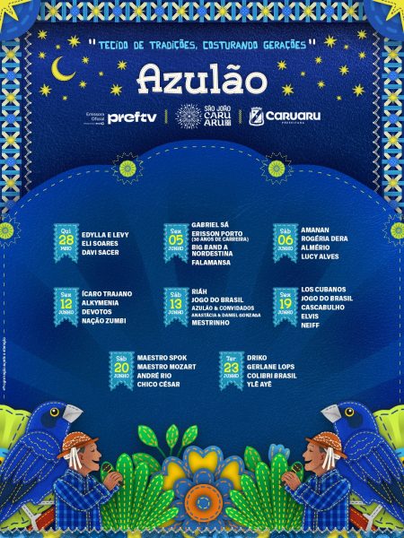 O pontapé inicial será no dia 10 de abril com o São João na Roça, começando pela comunidade de Lajes. A novidade deste ano é o Forró da Federal, que será realizado no dia 22 de maio no pátio do Centro Acadêmico do Agreste (CAA) da Universidade Federal de Pernambuco (UFPE). O Polo Azulão inicia com a noite evangélica e segue com uma programação diversificada. A Nossa Drilha terá sua segunda edição neste ano, no dia 14 de junho, com Elifas Júnior, É o Tchan e Claudia Leitte. A programação segue até o dia 27 de junho no Pátio de Eventos Lua Gonzaga.